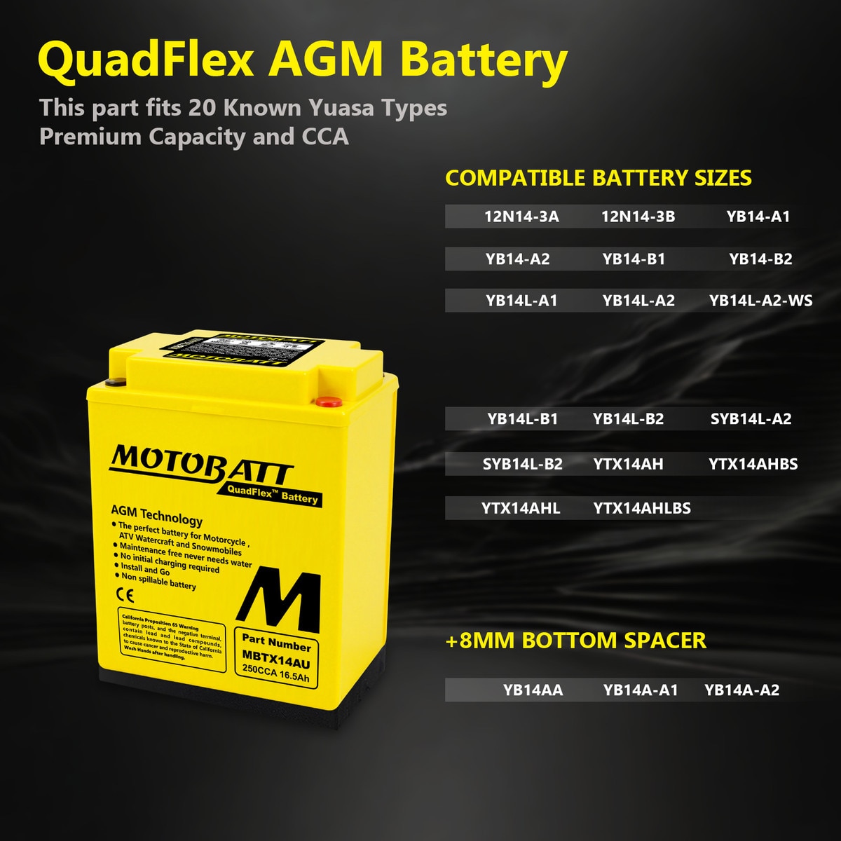 The MBTX14AU fits motorcycles, ATVs, and other powersports vehicles that use the YTX14AH, YTX14AHL and other YB14 sizes. Always confirm your battery’s dimensions and CCA requirements before ordering.